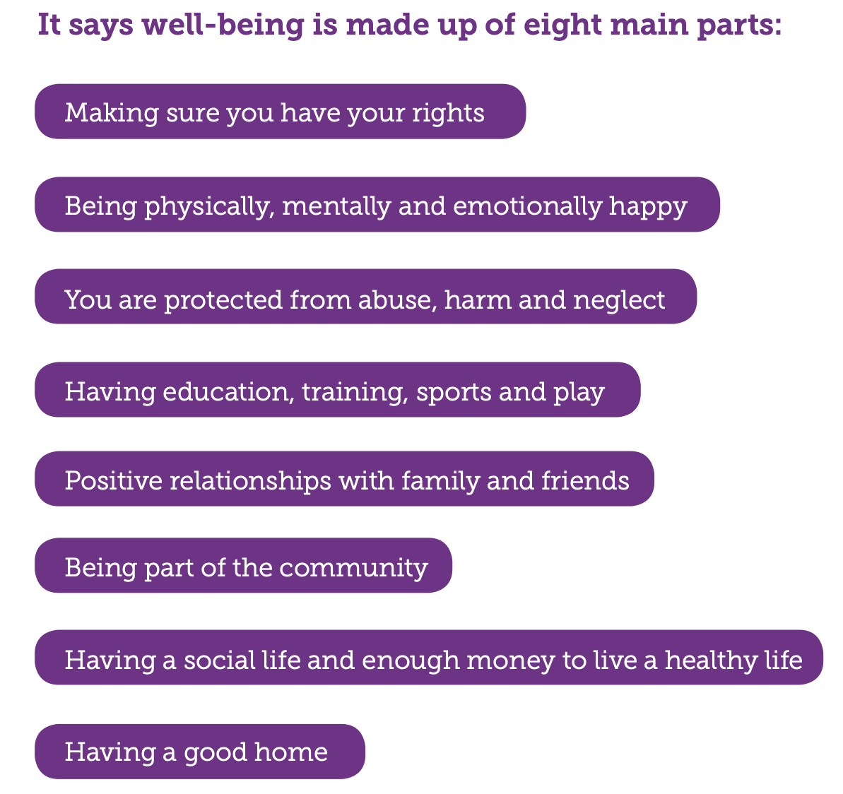 It is important to take the time to consider what wellbeing is and what is means to you. The Welsh government created a wellbeing statement which highlights the 9 areas of wellbeing. This is helpful to understand where needs might arise and whether you need support.